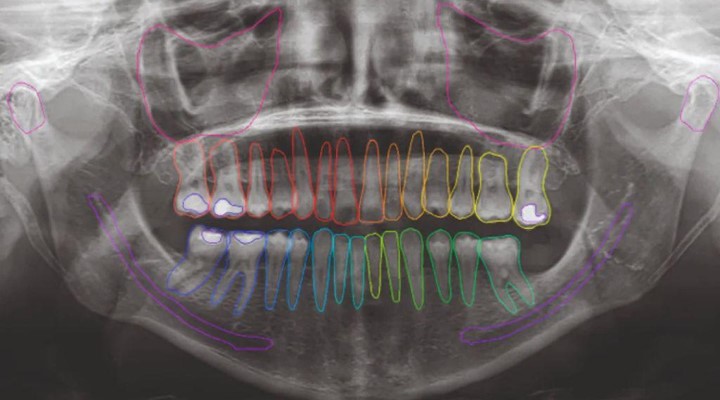 Using patented AI tools, it automatically identifies anatomical structures, traces nerves, segments images, and highlights potential issues in both panoramic and intraoral views.